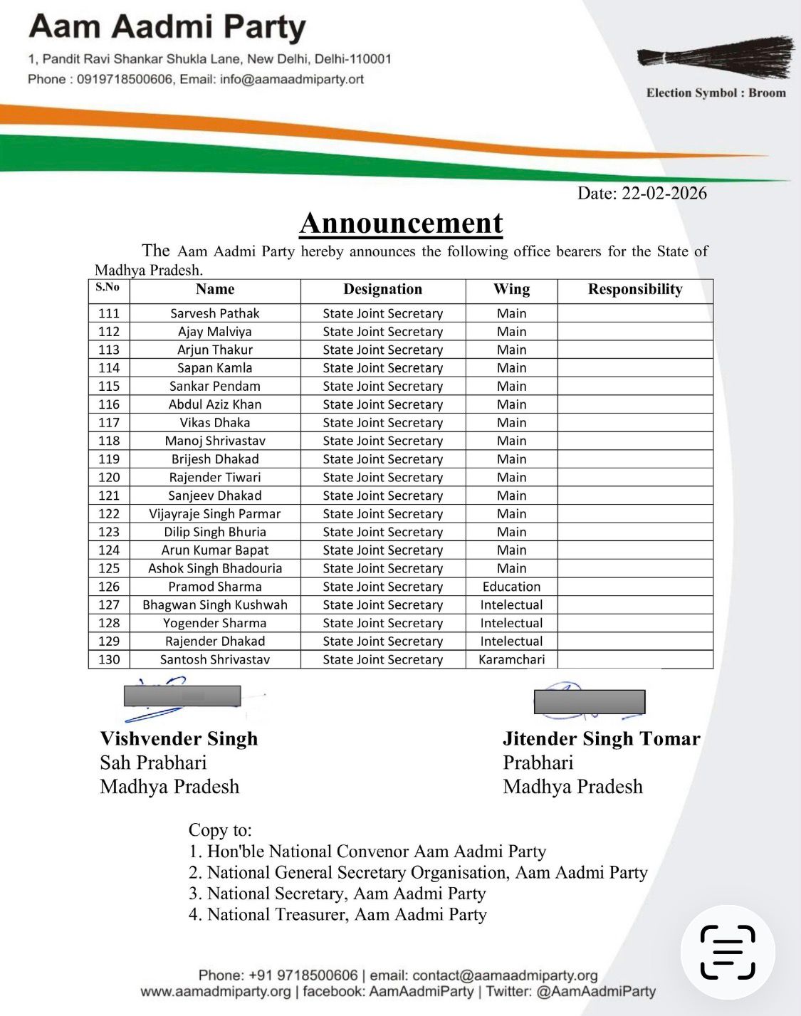 साथ ही सारणी के सपन कामला एवं बैतूल के शंकर पेंद्राम एडवोकेट को भी आम आदमी पार्टी में प्रदेश ज्वाइंट सेक्रेटरी के रूप में बड़ी जिम्मेदारी सौंपी गई है।