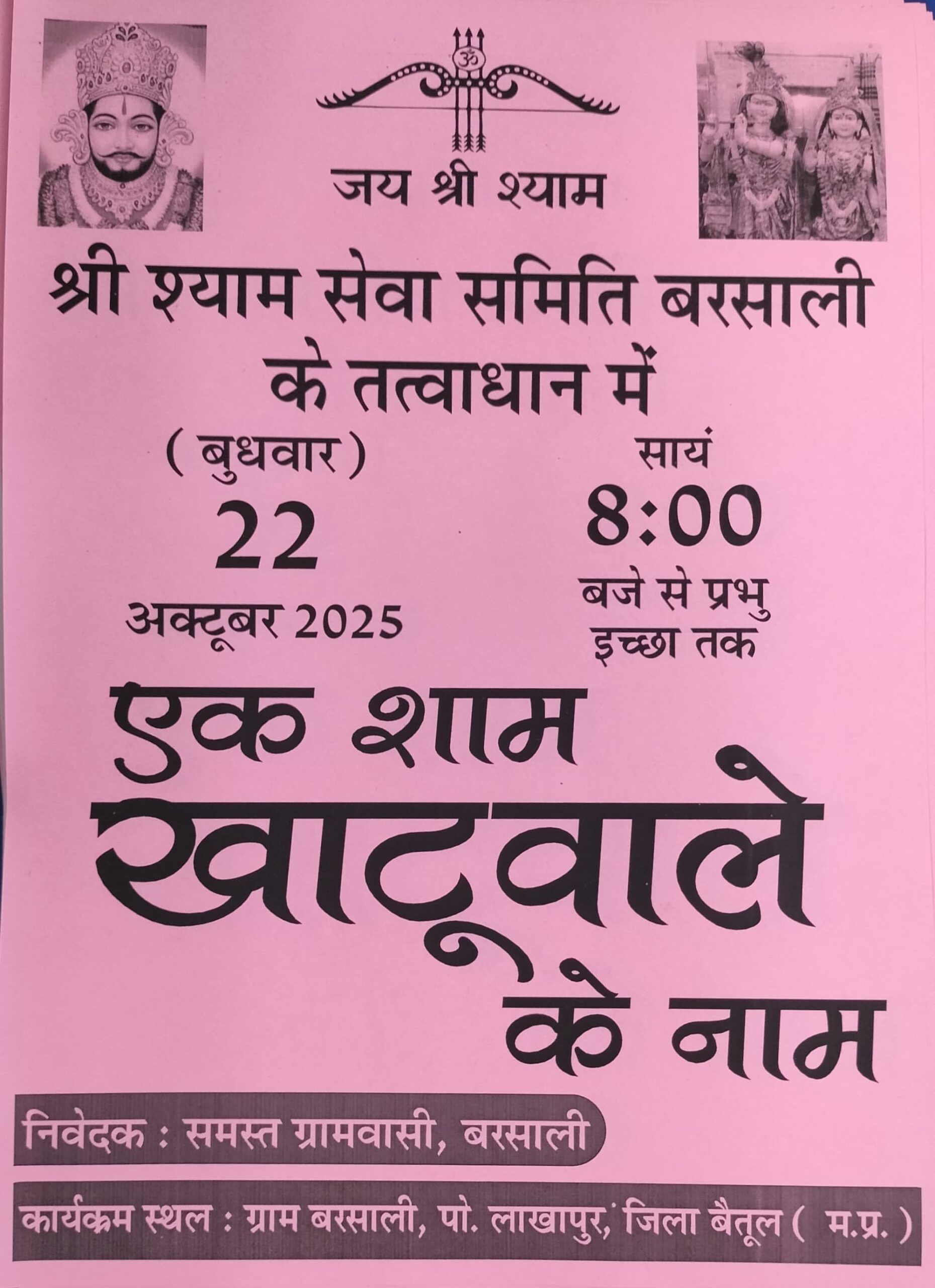 बैतूल। श्री श्याम सेवा समिति बरसाली के तत्वाधान में ग्राम बरसाली में बुधवार 22 अक्टूबर को रात्रि 8 बजे से प्रभु इच्छा तक एक शाम खाटूवाले के नाम भजन संध्या का आयोजन किया जाएगा। आयोजन में भक्तगण खाटू श्याम के भजनों पर झूमेंगे। आयोजन समिति ने श्रद्धालुओं से अधिक से अधिक संख्या में उपस्थित होकर भजन संध्या में भाग लेने की अपील की है।