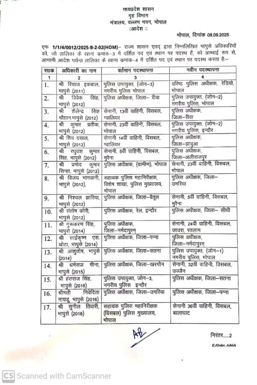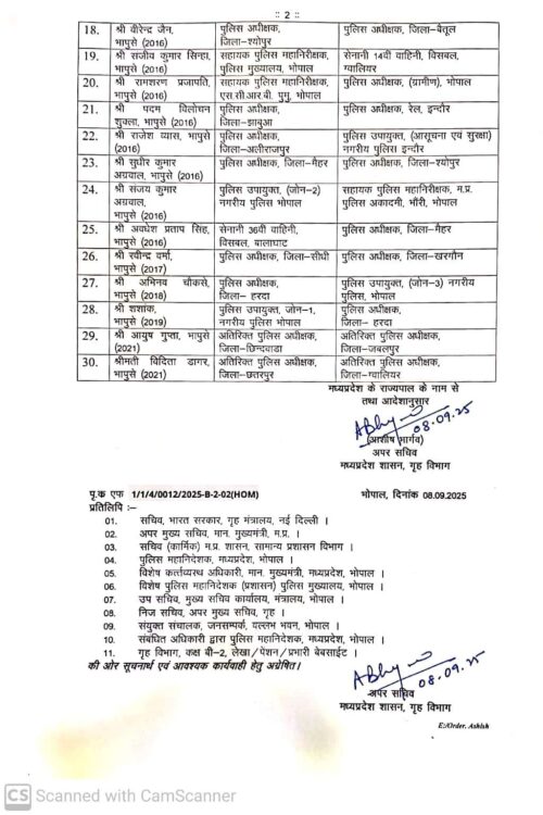 Betul Sp Transfer: भोपाल। मध्यप्रदेश शासन ने सोमवार रात पुलिस विभाग में बड़े पैमाने पर तबादले किए। जारी आदेश के मुताबिक 30 से अधिक आईपीएस अधिकारियों के पदस्थापना स्थल बदले गए हैं।