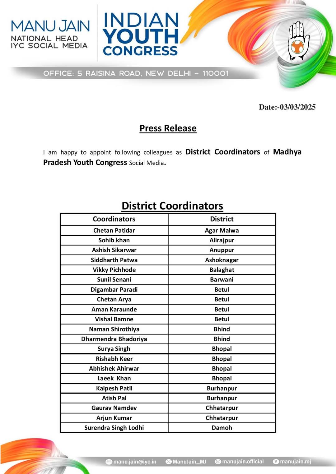 बैतूल। युवा कांग्रेस के डिजिटल प्रचार को धार देने और संगठन को सोशल मीडिया पर और अधिक प्रभावी बनाने के लिए मध्यप्रदेश युवा कांग्रेस सोशल मीडिया विभाग ने बैतूल जिले में नई नियुक्तियां की हैं। युवा कांग्रेस के सोशल मीडिया विभाग के राष्ट्रीय हेड मनु जैन ने बैतूल जिले के डीगम्बर पारधी, चेतन आर्य, अमन किरोदे और विशाल बामने को सोशल मीडिया जिला समन्वयक नियुक्त किया है। इन सभी को युवा कांग्रेस का बैतूल जिला कोऑर्डिनेटर और समन्वयक बनाया गया है।