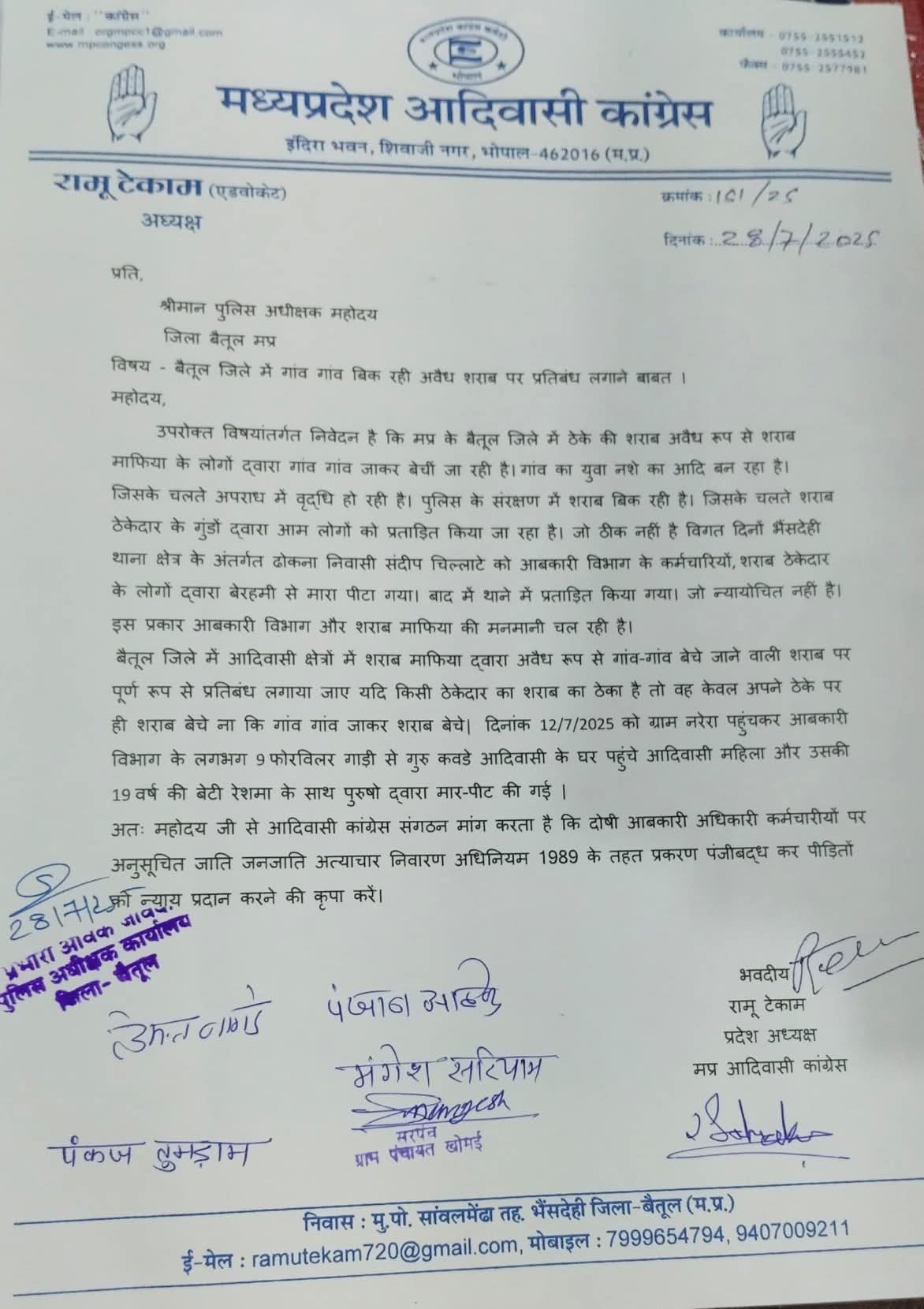 बैतूल। जिले के आदिवासी क्षेत्रों में अवैध शराब बिक्री और प्रशासनिक चुप्पी के विरोध में आदिवासी कांग्रेस ने सख्त रुख अपनाया है। भैंसदेही और आमला क्षेत्र में आदिवासी युवक और युवतियों के साथ हुई मारपीट व प्रताड़ना के मामलों को लेकर मध्यप्रदेश आदिवासी कांग्रेस के प्रदेश अध्यक्ष रामू टेकाम के नेतृत्व में कांग्रेस के प्रतिनिधिमंडल ने पुलिस अधीक्षक को ज्ञापन सौंपते हुए दोषियों पर कड़ी कार्रवाई और अनुसूचित जनजाति अत्याचार निवारण अधिनियम के तहत प्रकरण दर्ज करने की मांग की।