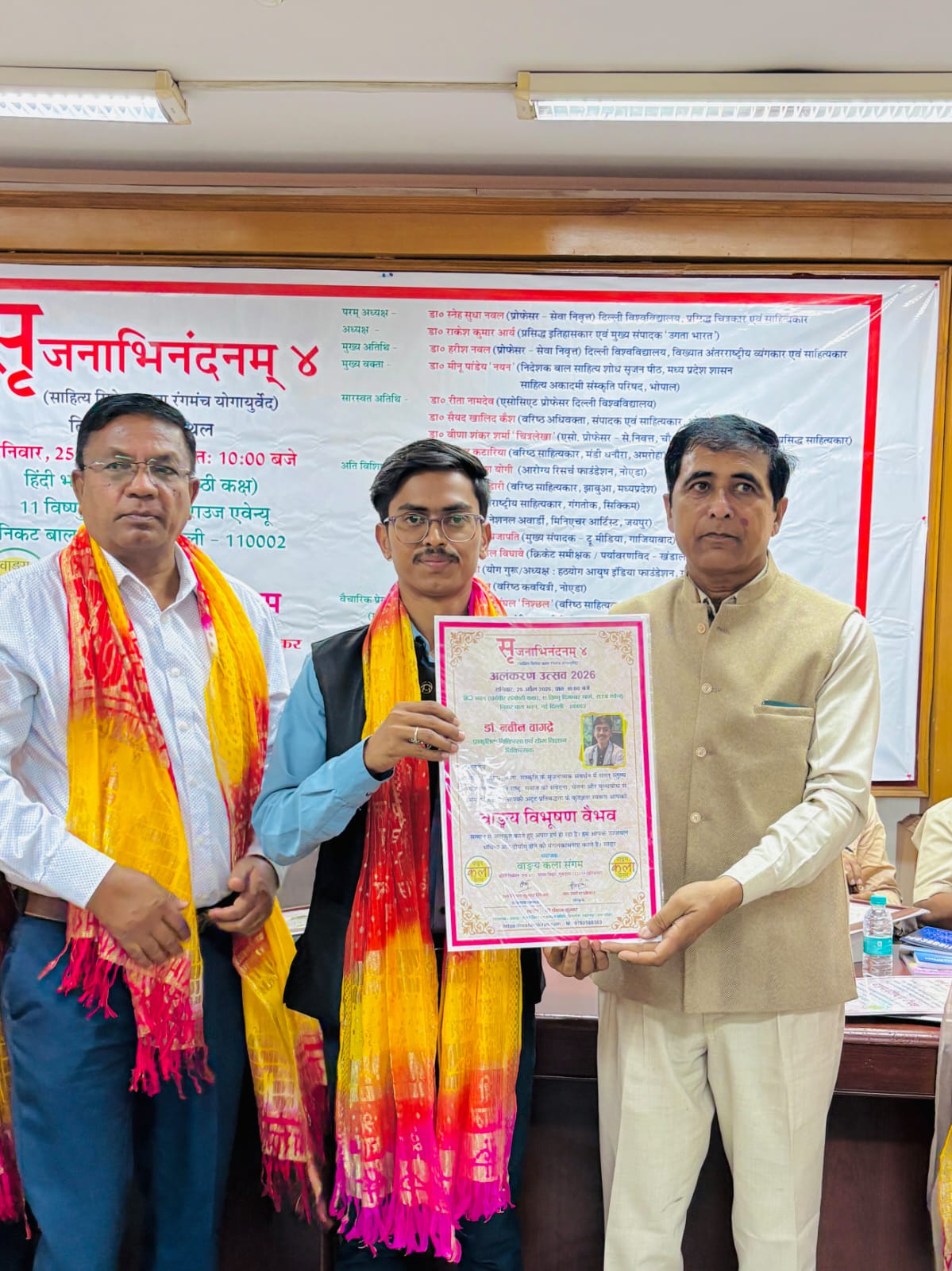 राजधानी दिल्ली में आयोजित प्रतिष्ठित सांस्कृतिक कार्यक्रम ‘सूजनाभिनंदनम् 4’ में आज प्राकृतिक चिकित्सा एवं योग विज्ञान (BNYS) के चिकित्सक डॉ. नवीन वागद्रे को उनके उत्कृष्ट योगदान के लिए “वाङ्मय विभूषण वैभव” सम्मान से अलंकृत किया गया। यह कार्यक्रम हिंदी भवन, नई दिल्ली में आयोजित हुआ, जिसमें साहित्य, सिनेमा, कला और रंगमंच से जुड़े कई गणमान्य लोग उपस्थित रहे।
