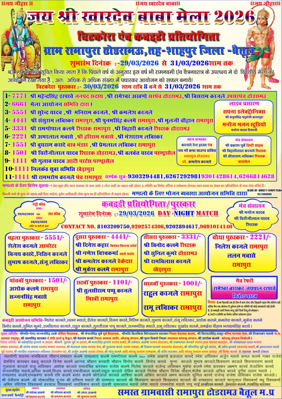 बैतूल। ग्राम रामापुरा ढोडरामऊ में तीन दिवसीय जय श्री खारदेव बाबा मेला आयोजित किया गया। मेले में 30 मार्च से चिटकोरा प्रतियोगिता शुरू हुई, जो 31 मार्च शाम तक चली। चिटकोरा प्रतियोगिता में पहले स्थान के लिए 7771 रुपये का पुरस्कार महेन्द्रसिंह इरपाचे जनपद सदस्य, रामेश्वर अखण्डे सरपंच टोडरामऊ और बिसराम काजले उपसरपंच ढोडरामऊ की ओर से दिया गया। दूसरे स्थान के लिए 6661 रुपये मेला आयोजन समिति की ओर से दिए गए। तीसरे स्थान के लिए 5551 रुपये सुरेन्द्र यादव, मनिराम काजले और कमलेश काजले की ओर से रखे गए।