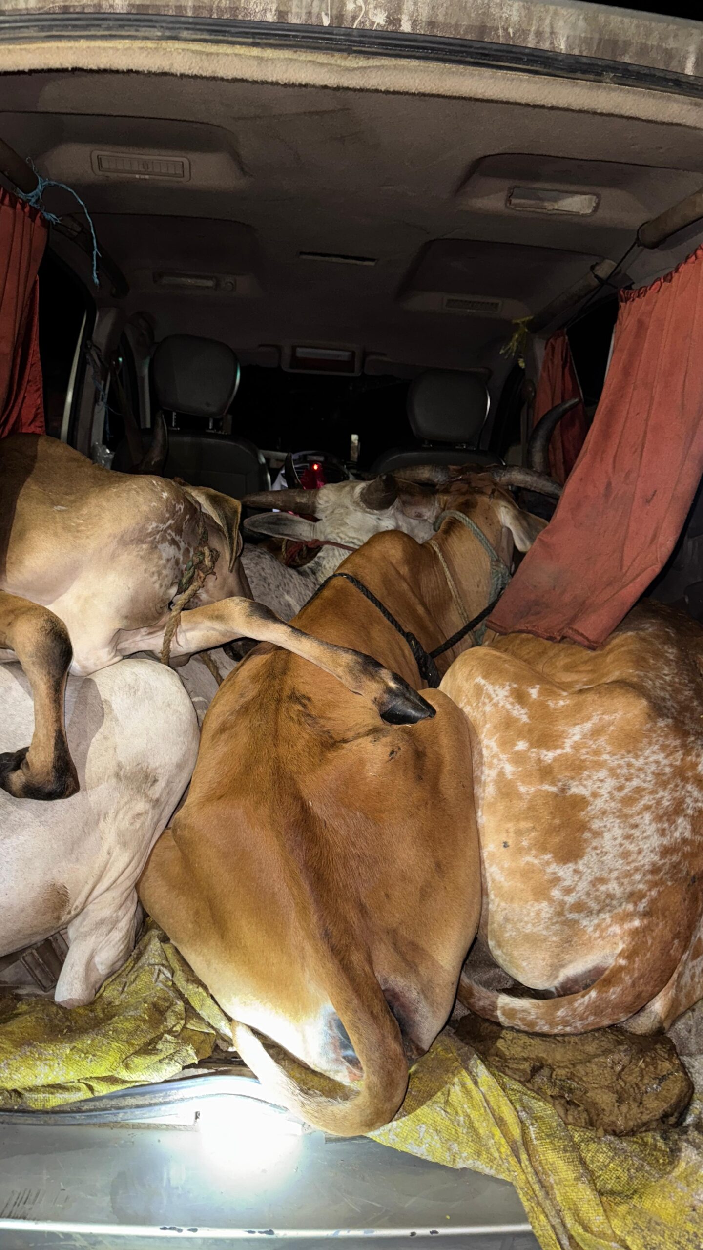 तहसील गौरक्षा प्रमुख आशीष यादव ने बताया कि तस्करों ने जाइलो गाड़ी की पिछली सीटें काटकर उन्हें क्रूरता पूर्वकर अंदर 8 नग गायों को ठूंस-ठूंस कर भरा था। सभी गायों के मुंह और पैर रस्सियों से बांधे गए थे। इन्हें भूखा-प्यासा ठूंसकर लाया जा रहा था।