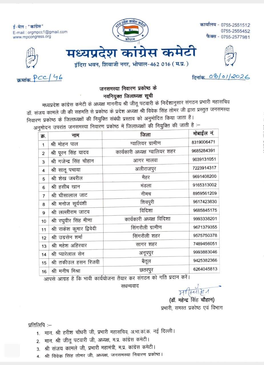 बैतूल। मध्यप्रदेश कांग्रेस कमेटी के अध्यक्ष जीतू पटवारी के निर्देशानुसार तथा संगठन प्रभारी महासचिव डॉ. संजय कामले की सहमति से कांग्रेस जनसमस्या निवारण प्रकोष्ठ के प्रदेश अध्यक्ष। विवेक सिंह तोमर द्वारा प्रस्तुत जिलाध्यक्षों की नियुक्ति संबंधी प्रस्ताव को अनुमोदन प्रदान किया गया है। अनुमोदन के उपरांत जनसमस्या निवारण प्रकोष्ठ में जिलाध्यक्षों की नियुक्ति की घोषणा की गई, जिसके अंतर्गत तकीउल हसन रिजवी को बैतूल जिले का जिलाध्यक्ष नियुक्त किया गया है।