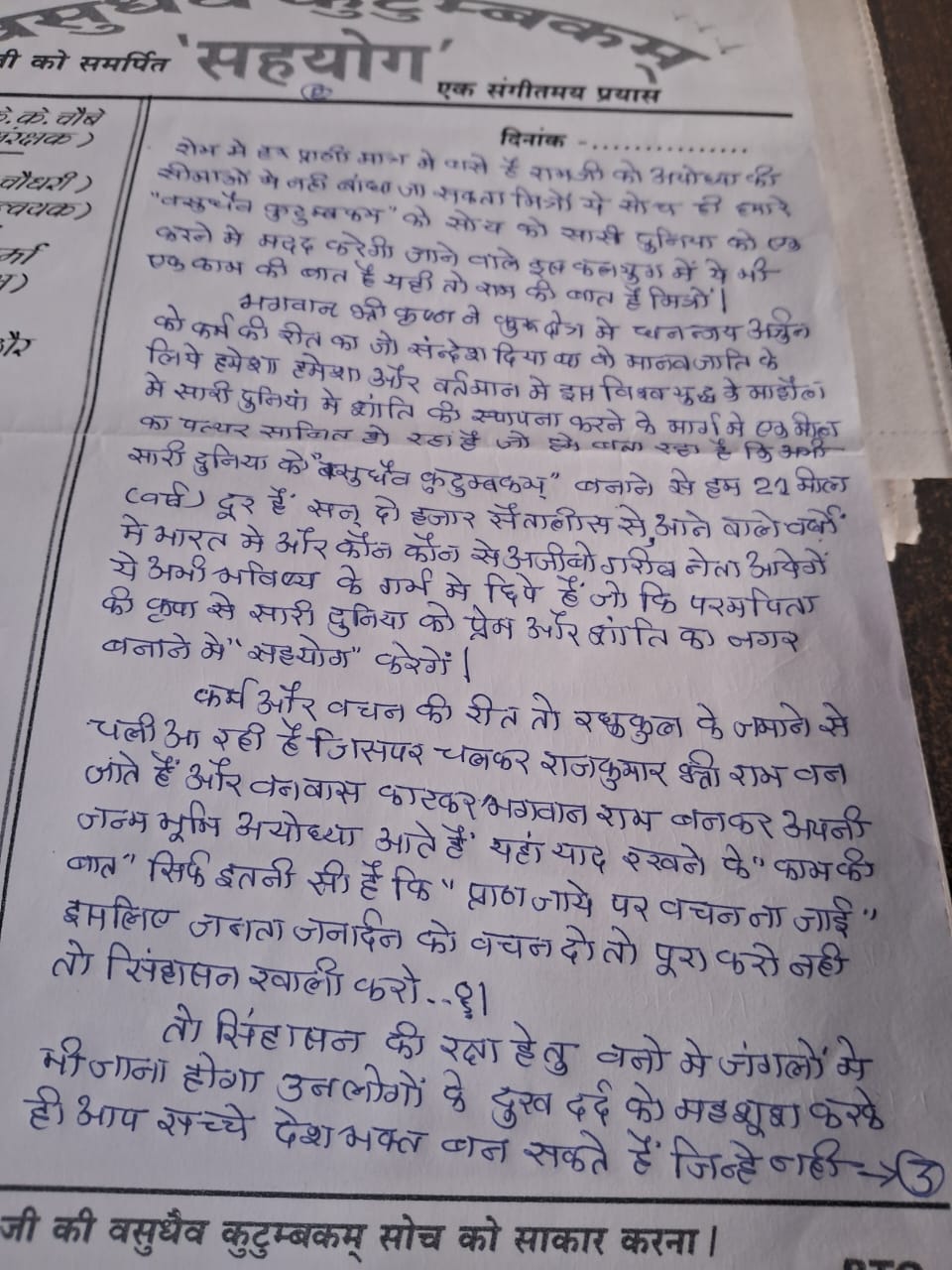 “सहयोग” की महिमा बड़ी निराली है मित्रों। परम पिता परमेश्वर की कृपा रूपी आशीर्वाद और माता-पिता के सहयोग से हम इस धरती माता पर आए। दो आत्माओं के सहयोग से एक होकर जीवन का सृजन होता है। है ना चमत्कार? आज के विज्ञान और गणित से परे, जहाँ 1+1 बराबर 2 नहीं, बल्कि एक ही हो जाता है एकाकार। हम उसी एकाकार स्वरूप का साकार रूप हैं। यदि यह सोच हम सबकी हो जाए तो यह दुनिया स्वर्ग से कम नहीं होगी, और यह सभी के सहयोग से ही संभव है। यही सत्य है और यही सोच आज के विश्व युद्ध जैसे माहौल रूपी महाभारत में देशों की सीमाओं रूपी जंजीरों को तोड़कर “वसुधैव कुटुम्बकम्” की भावना को साकार कर सकती है। “मानव”, जो माँ का ही नया रूप है, को साकार करने में सभी के सहयोग से एक बार फिर इस कलयुग में सम्पूर्ण रामायण रचेगी—आज नहीं तो कल। इसमें चिंता की क्या बात है? यह भी एक काम की बात है।