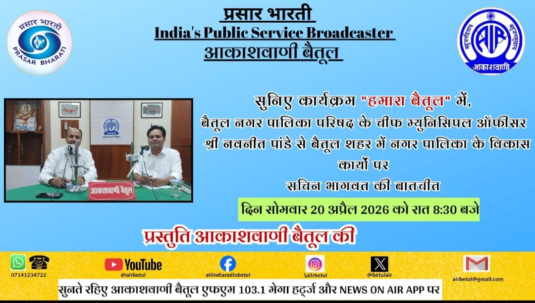 बैतूल। प्रसार भारती के अंतर्गत आकाशवाणी बैतूल से सोमवार, 20 अप्रैल को रात 8:30 बजे कार्यक्रम हमारा बैतूल प्रसारित किया जाएगा।