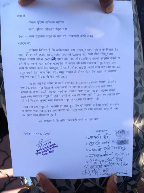 fraud: बैतूल। स्वयं सहायता समूह के नाम पर ग्रामीणों के साथ धोखाधड़ी का मामला सामने आया है। ग्राम महतपुर, थाना मोहदा के पीड़ित ग्रामीणों ने वरिष्ठ समाजसेवी हेमंत सरियाम एवं युआवि संगठन जिला अध्यक्ष जितेंद्र सिंह इवने के नेतृत्व में पुलिस अधीक्षक को ज्ञापन सौंपा। पुलिस अधीक्षक ने मामले की गंभीरता को देखते हुए एसडीओपी से जांच कर एफआईआर दर्ज करने के निर्देश दिए हैं।